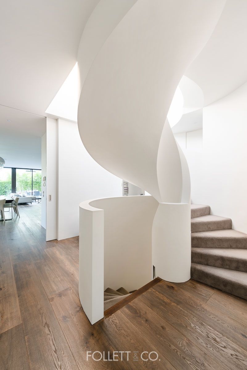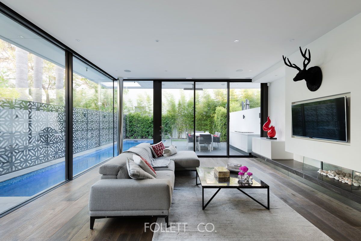 Wide oak floors run through the ground floor with high ceilings, which has an open entry where the free flowing curved staircase, as well as views all the way down to the tranquil pool at the rear, immediately catch your eye. Walk down the long hall and fall in love with the expansive central living zone, with the dedicated lounge graced with a tranquil gas fireplace, while the dining space is surrounded by the pool which comes all the way to the glass making you feel like you're walking on water.