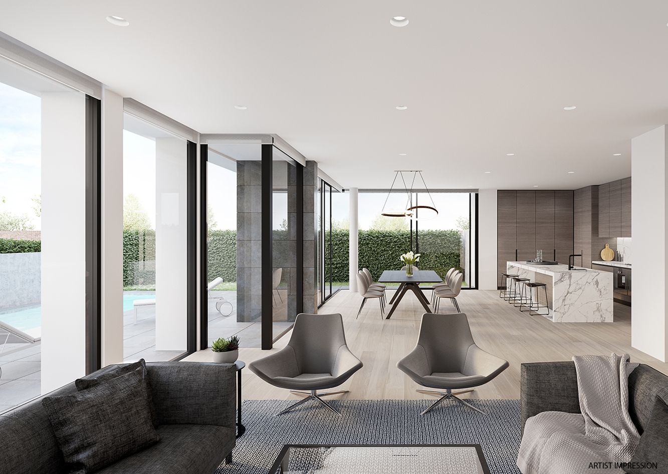 An expansive and bright central living area seamlessly integrates with the north-west facing outdoor zone at the rear. This main living hub consists of a spacious lounge with stone fireplace and bright 3 meter floor-to-ceiling windows with garden and courtyard views, generous dining, and a gourmet kitchen delivering an island bench, butler’s pantry, integrated fridge, and premium Gaggenau appliances including a fully-integrated dishwasher.