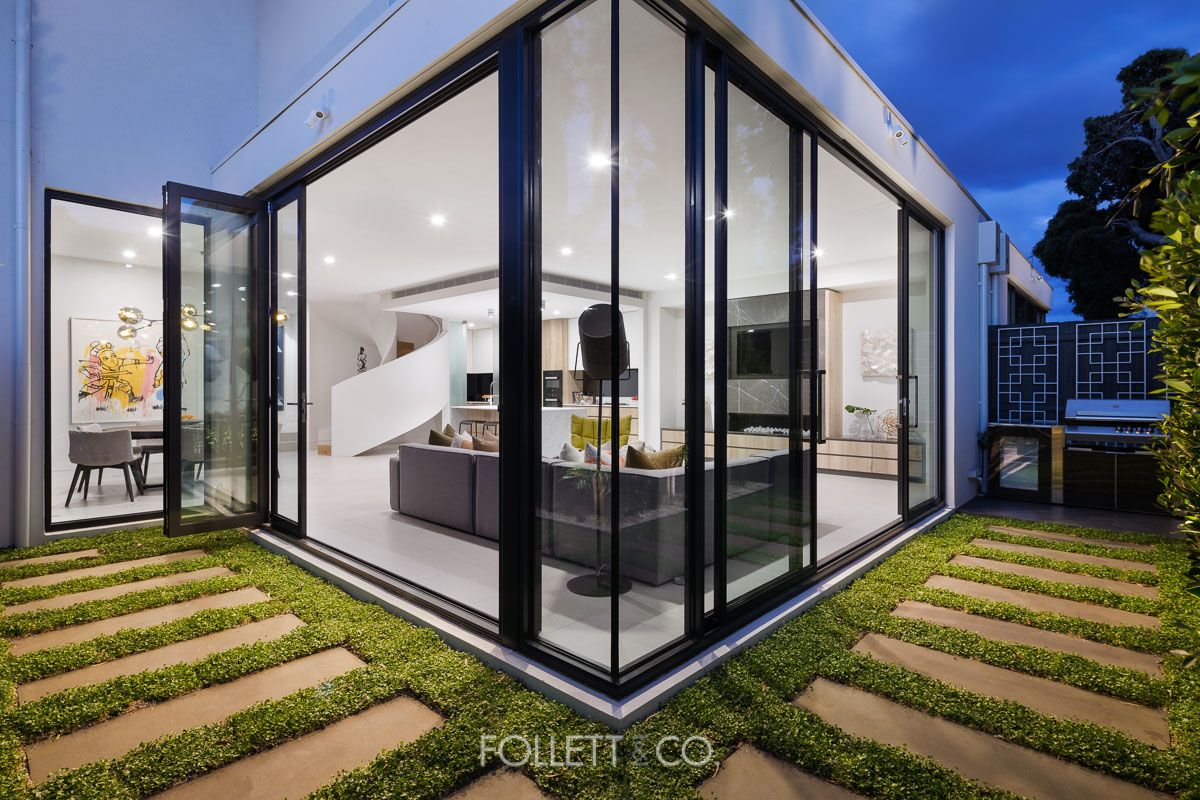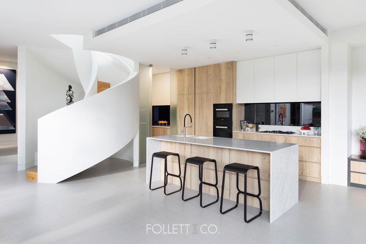 Once you get inside you’ll appreciate the detail and thought that has gone into every corner of this property. The stunning entrance lined with European Travertine leads you to the striking sculptural cylindrical staircase. This makes way for an expansive central lounge and dining zone, which is filled with brilliant natural light and stylish terrazzo floors. This area also enjoys a Pietra Grigio Marble feature gas fireplace with space for an integrated TV. The Carrara marble kitchen is incorporated into this central hub and includes a butler’s pantry and premium Miele appliances including an integrated dishwasher and microwave.