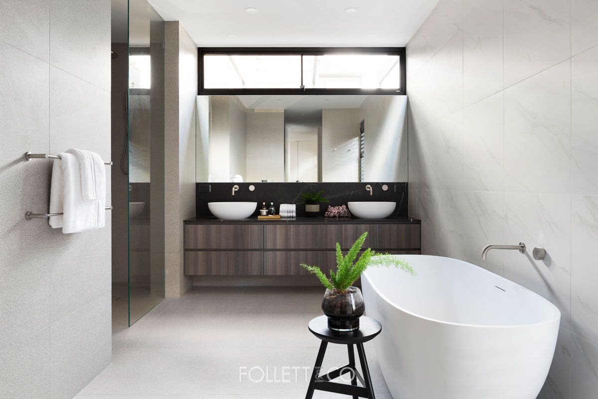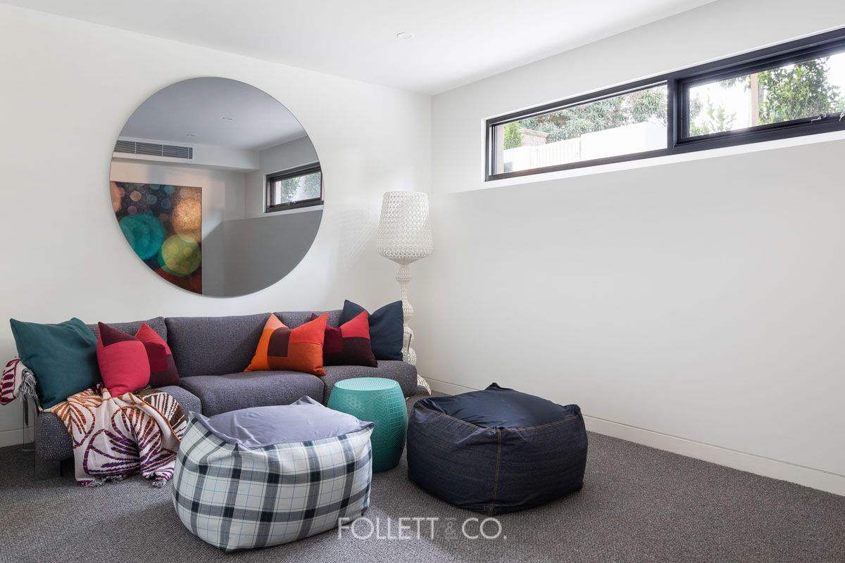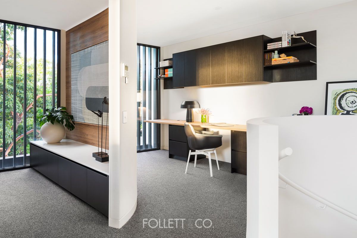 A ground floor master bedroom promises a walk-in robe and an incredible dual vanity ensuite which showcases a freestanding stone bath, elegant tapware, and rain shower. Up the feature spiral staircase with a unique circular skylight you’ll arrive on the top floor, where a large living retreat awaits as does a generous study area with a long built-in desk and custom suspended shelving. This upstairs level further boasts two bedrooms with BIRs (including one bedroom with an ensuite) and a sleek main bathroom.